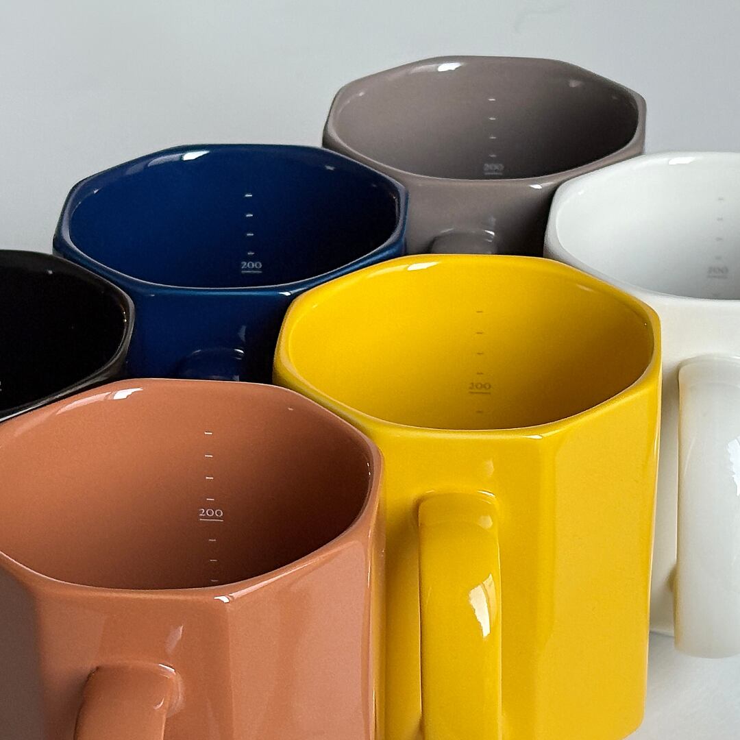 本体の内側に100mlから20ml単位で計量用の目盛がプリントされている磁器製マグカップ。