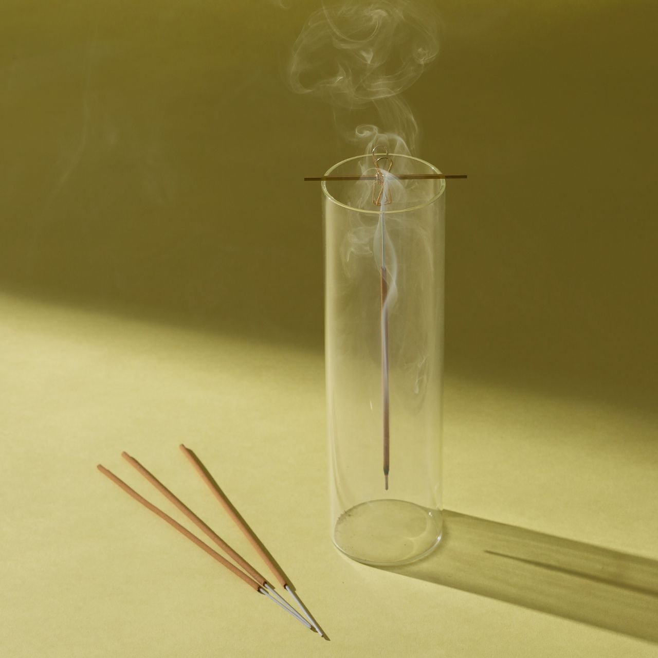 付属のピンでお香を吊るすことで、ガラスに灰を落とします。