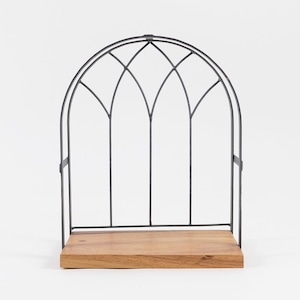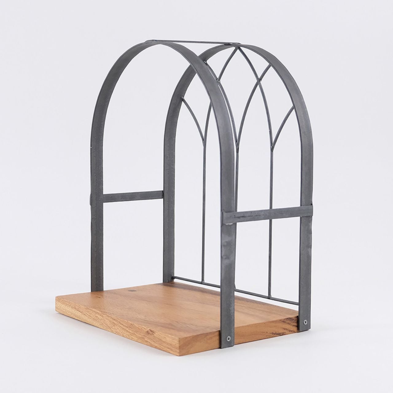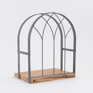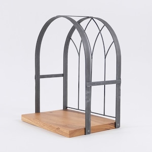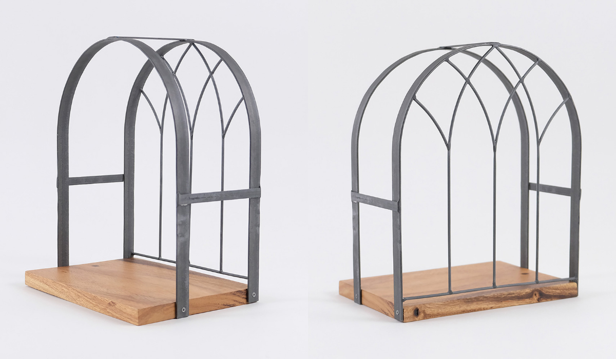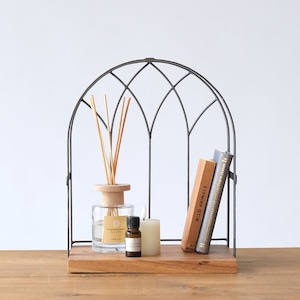窓枠のようなデザインが印象的な、ディスプレイスペース付きの飾り棚。