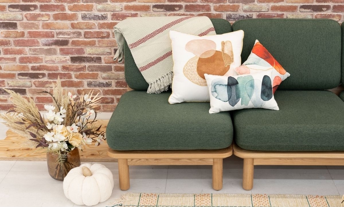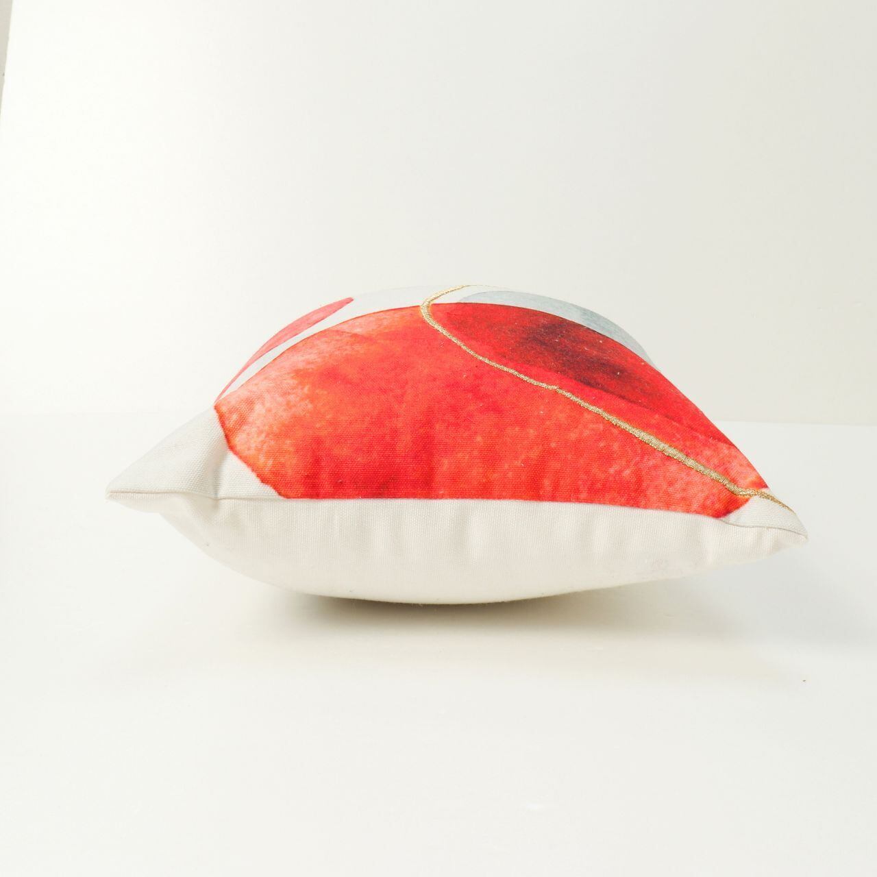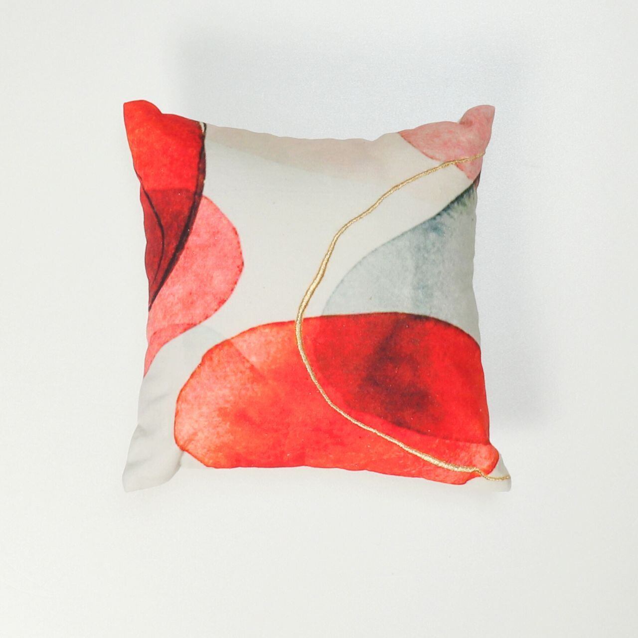 水彩画風のデザインにプリントや刺繍のテクニックを合わせたクッション。