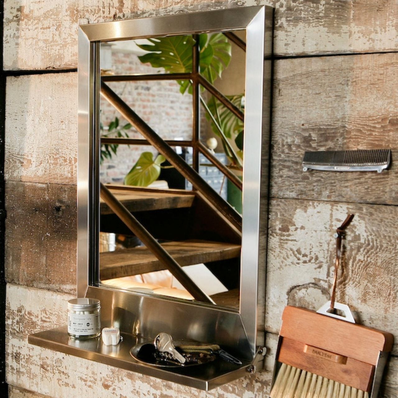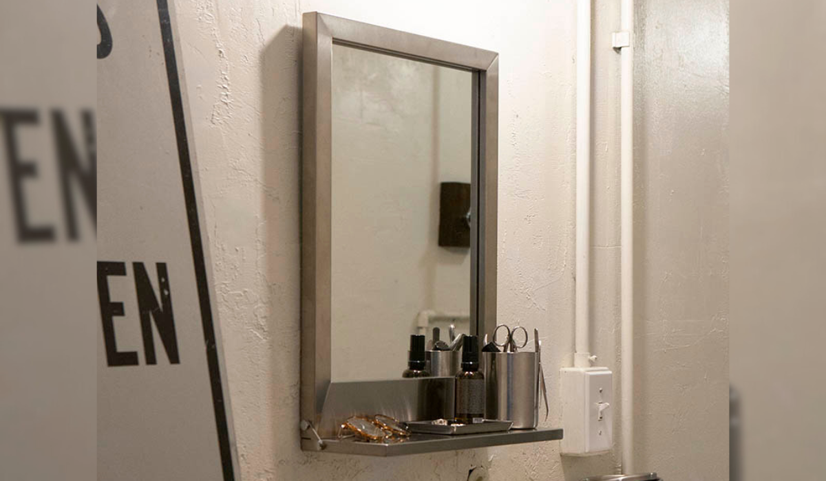 無駄を削ぎ落とした、ステンレスフレームの棚付きミラー。
