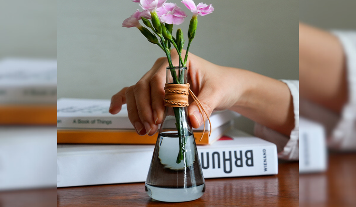 ミニサイズの三角フラスコのようなコニカルフォルムが特徴で、遊び心のある佇まいながらも、すっきりとした印象でインテリアに自然と溶け込みます。