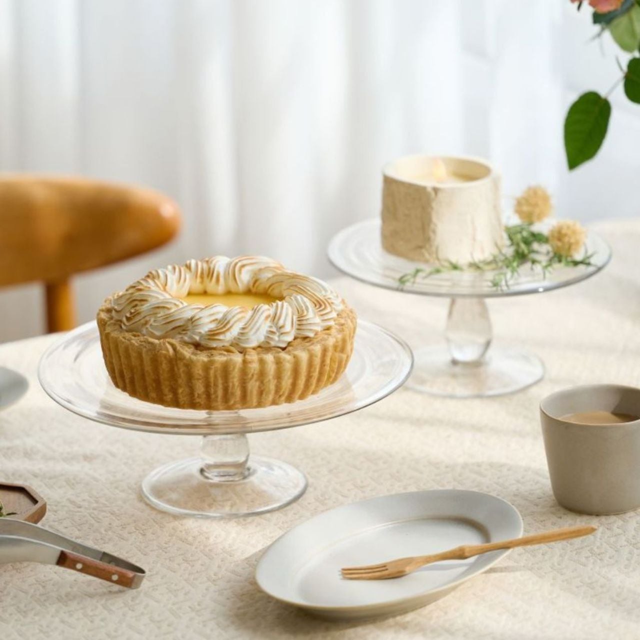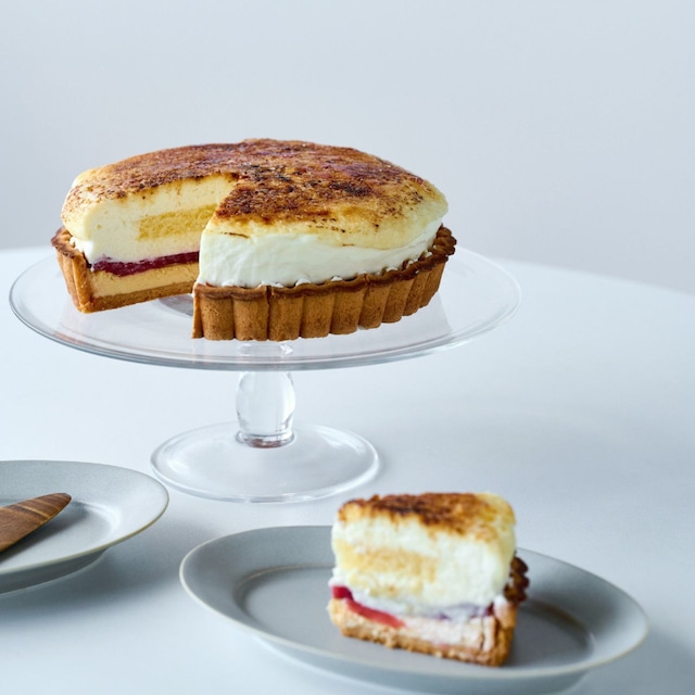 無色透明のシンプルな佇まいは、ケーキの美しさを引き立てる静かな存在感。