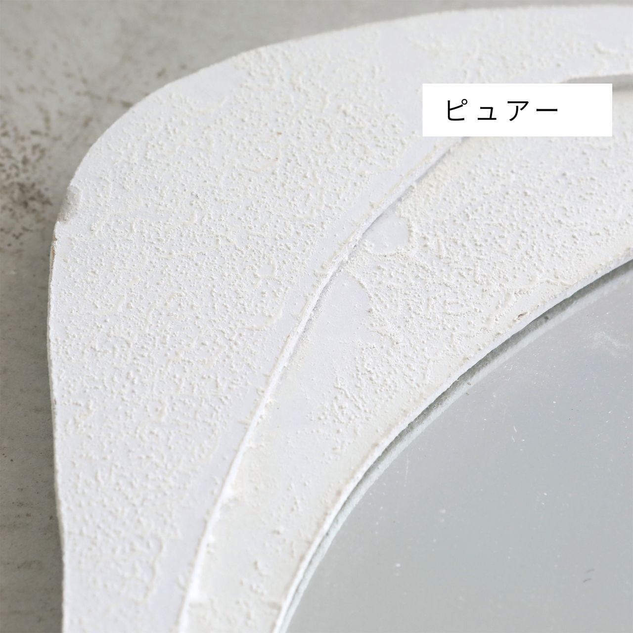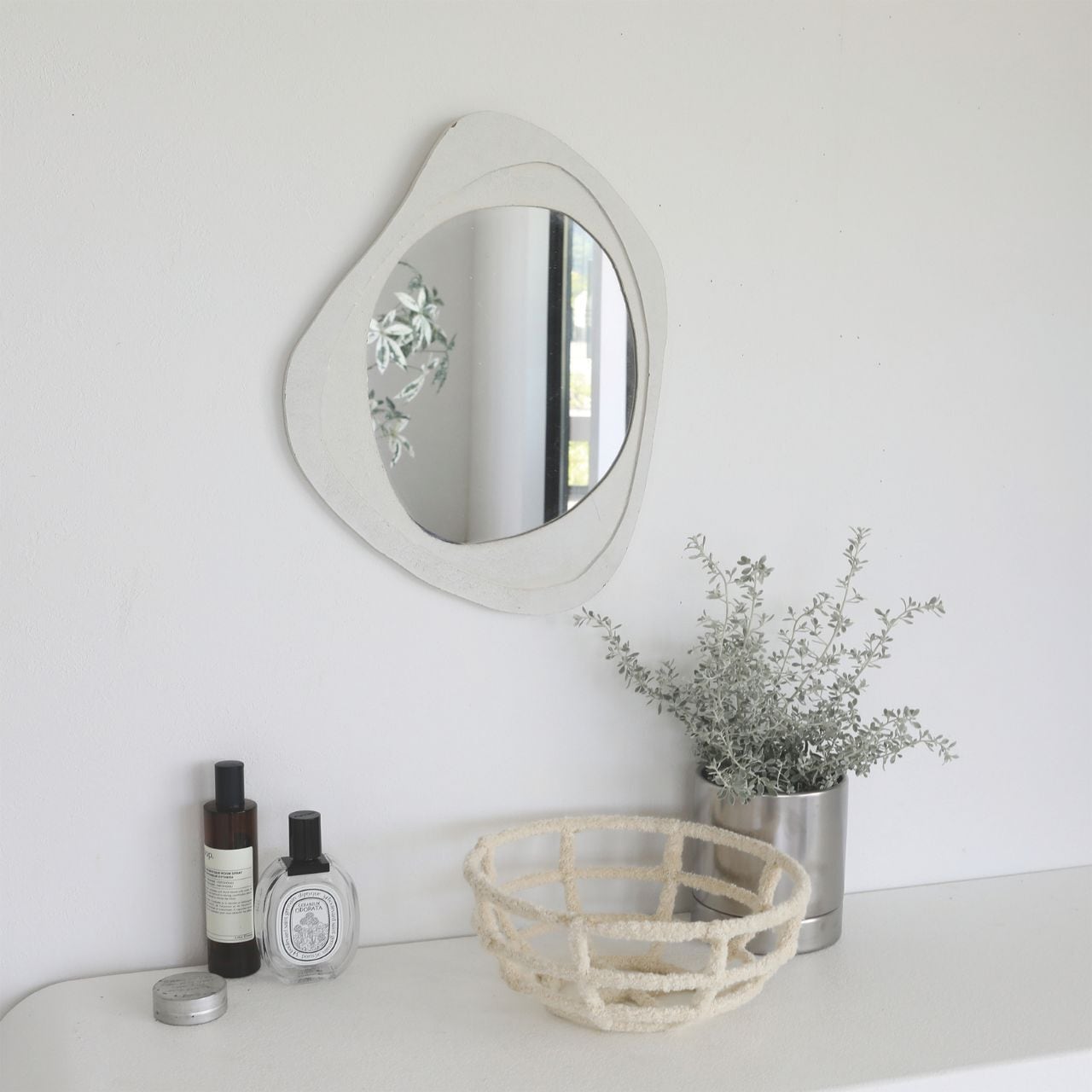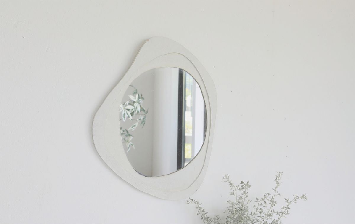 不規則な円のミラーにおぼつかない枠がプラスされた、 「余白を愉しむ」置型&壁掛けミラーです。