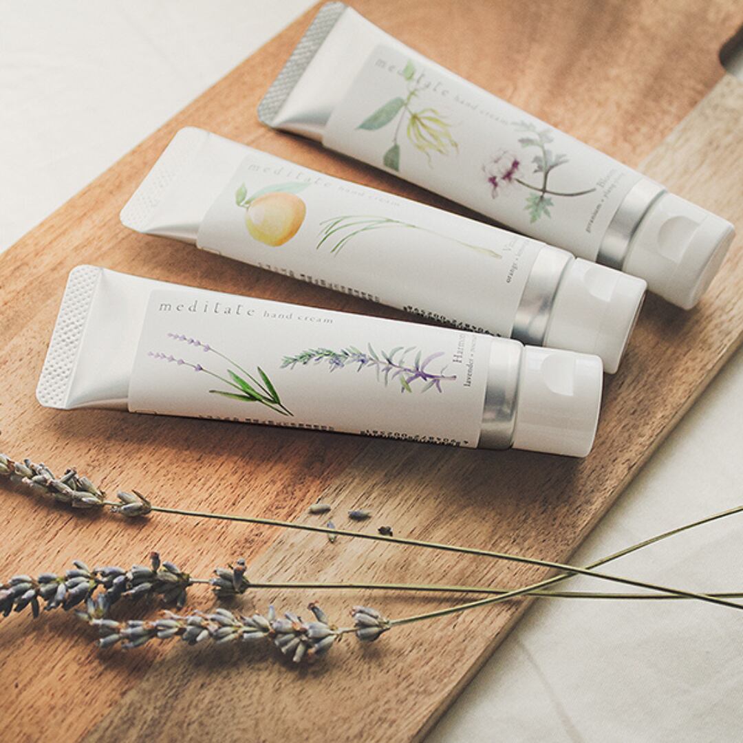 メディテイトハンドクリームは保湿成分に天然のマカデミアナッツ油やシアバターを配合した、
